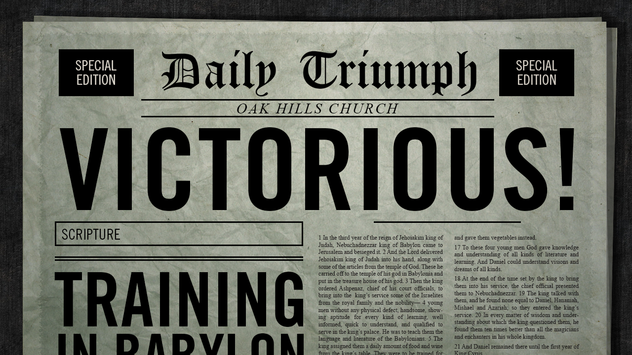 Videos Study Tools Details Recommended Decide Now for God WEEK 1 Share this Sermon Share Share this Sermon Copy Link There is a God in Heaven WEEK 2 Share this Sermon Share Share this Sermon Copy Link Stand Up - Stand Out WEEK 3 Share this Sermon Share Share this Sermon Copy Link When the Mighty Fall WEEK 4 Share this Sermon Share Share this Sermon Copy Link Is Nothing Sacred? WEEK 5 Share this Sermon Share Share this Sermon Copy Link No Lion, God Delivers WEEK 6 Share this Sermon Share Share this Sermon Copy Link The Final Kingdom WEEK 7 Share this Sermon Share Share this Sermon Copy Link Anticipate the Antichrist WEEK 8 Share this Sermon Share Share this Sermon Copy Link Number the Days WEEK 9 Share this Sermon Share Share this Sermon Copy Link It’s a Battle, Not a Picnic WEEK 10 Share this Sermon Share Share this Sermon Copy Link Consider the Prophecies WEEK 11 Share this Sermon Share Share this Sermon Copy Link Look Forward with Hope WEEK 12 Share this Sermon Share Share this Sermon Copy Link Study Guide Use your Bible and the weekly study sheets to engage in spiritual practices that help us hear from God. There are currently no study guides available. Sermon Notes Use the weekly sermon notes to follow along with each week's message. There are currently no sermon notes available. Small Groups Life was not meant to be lived alone! Check out our Groups page for more info! Join A Group Sermon Podcast You can watch or listen to our sermons on your mobile device via our podcasts! How cool?! Rightnow Media For more resources for you or your family, we have access to Rightnow Media’s online library! It’s completely FREE! Visit Rightnow Media About the Series - Daily Triumph The overarching message of Daniel’s days is this: how to live a life of faith in an increasingly faithless world. What did he know? What did he do? How can we adopt Daniel’s example into our own lives and culture? We’ll ask these questions and seek answers in our series, Daily Triumph. There are currently no recommended items.